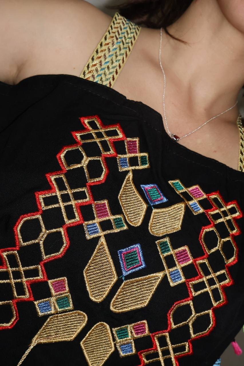 Authentic Black Moroccan Gandoura featuring vibrant geometric embroidery, crafted from breathable cotton for Dubai’s warm climate. This traditional yet stylish piece works equally well for casual souk visits or summer Eid celebrations. The loose, flowing cut ensures comfort while maintaining cultural modesty standards.