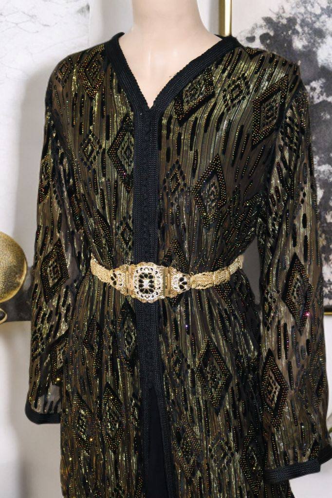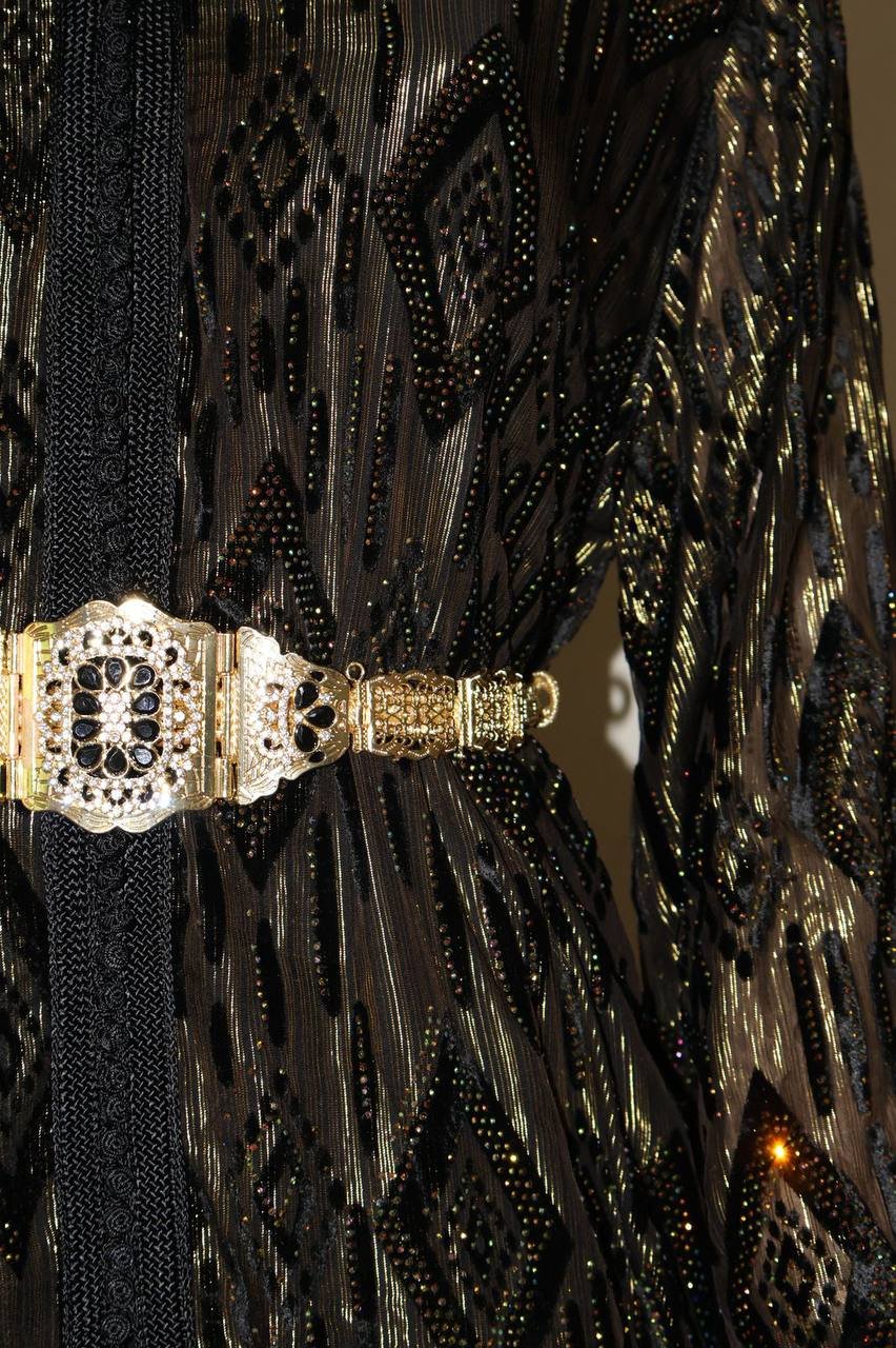 Exquisite handmade black Moroccan caftan featuring intricate gold embroidery, crafted from premium silk and velvet. This regal piece is perfect for Dubai weddings, Eid celebrations, or luxury evening events. Includes adjustable satin belt and matching clutch purse.