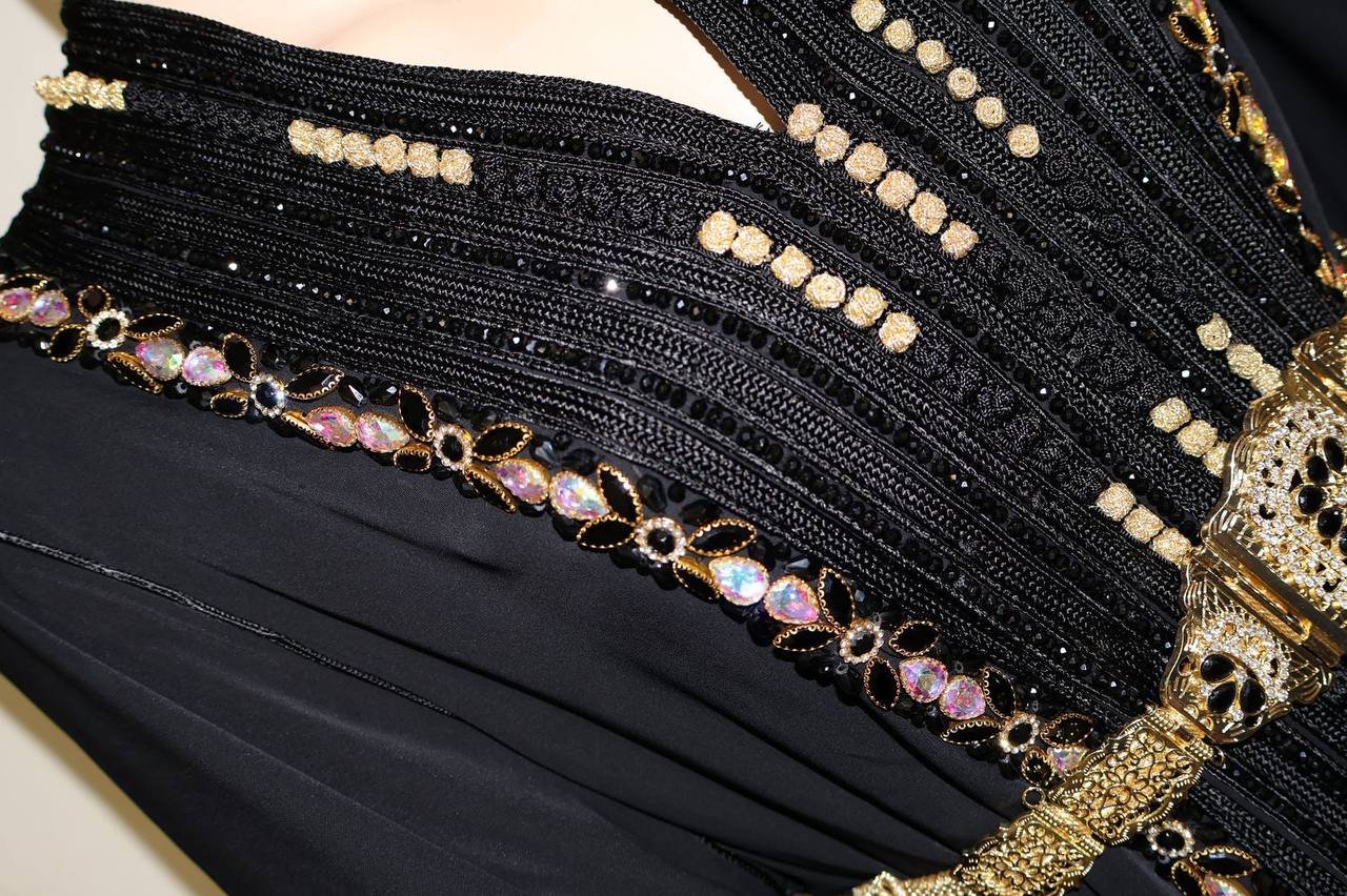 Exquisite handmade black Moroccan caftan featuring intricate silver embroidery, crafted from premium velvet and silk. This timeless piece embodies elegance for Emirates Palace weddings, Eid galas, or luxury evening events in Dubai. Includes adjustable satin belt for a perfect fit.